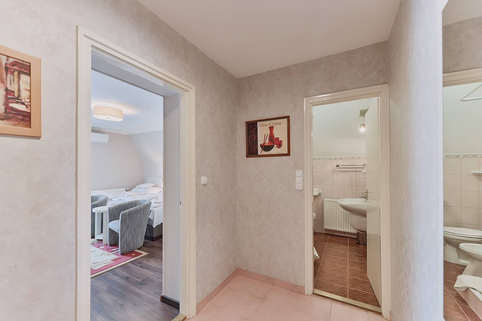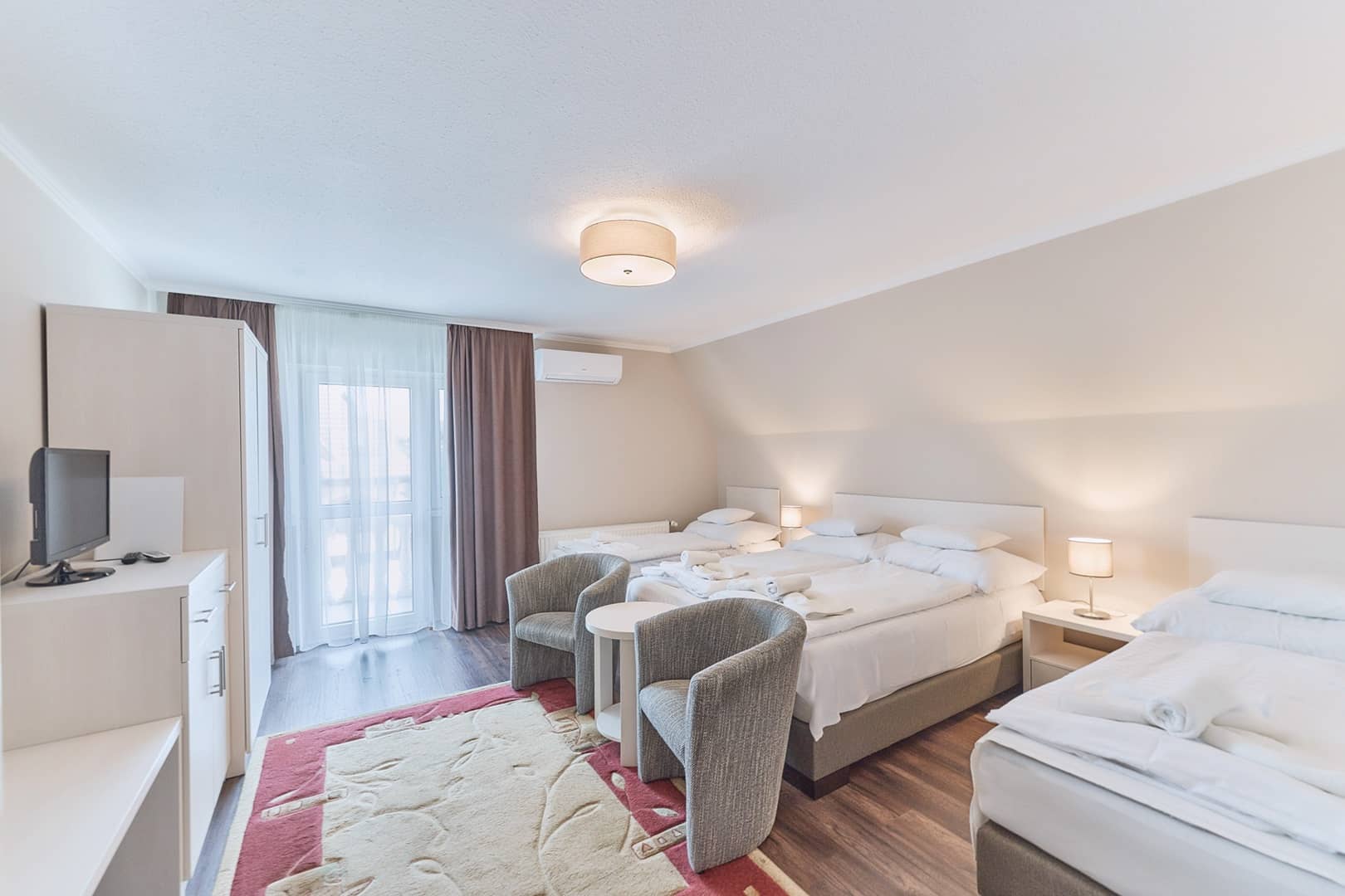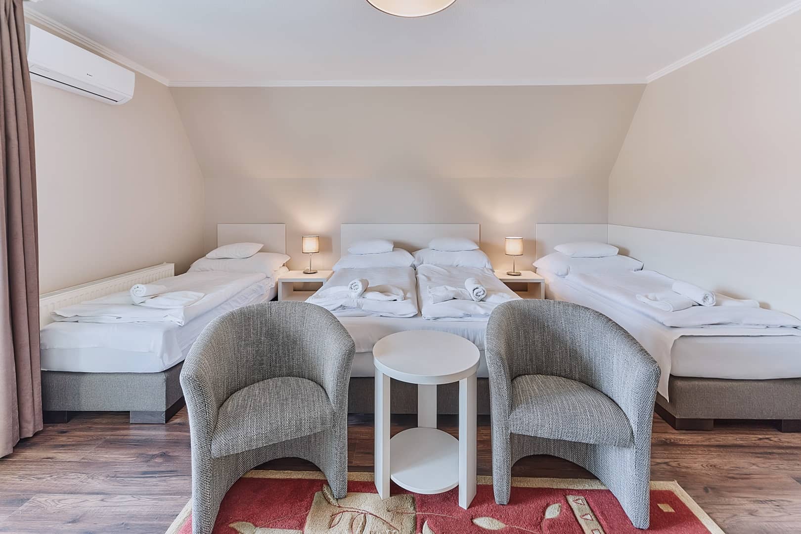 A Panzió területén 3 épület található. Az A épület a Recepció épülete, jobbra helyezkedik el a Panzió területén belül. Megközelíthető legegyszerűbben a teraszon keresztül, át a recepció folyosóján, valamint a kerten keresztül, a biliárd terem előtt jobbra fordulva (este 8 óra után csak ez az az útvonal használható). Összesen 44 fő együttesen elszállásolható. A B épület balra helyezkedik el a Panzió területén belül. Megközelíthető legegyszerűbben a kerten keresztül, a ping-pong rész előtt balra fordulva. Összesen 9 fő együttesen elszállásolható. A D épület leghátul helyezkedik el a Panzió területén. Megközelíthető az Apát utca felől a kerten keresztül, át a ping-pong részen, majd a játszótér mellett elhaladva a külső medence előtti bejáraton. Valamint a Móra Ferenc utca felől a kiskapun át balra az első épület. Összesen 45 fő együttesen elszállásolható. 1 db szoba 30 m2 alapterületű, erkélyes, nemdohányzó szoba. A D épület 1. emeletén található A szoba maximum 4 fő elszállásolására alkalmas. Nem pótágyazható, de babaágy elhelyezhető. (Kérjük, foglaláskor jelezze felénk előzetesen kérését.) A szoba saját fürdőszobával rendelkezik és zuhanyzóval, toalettel, tükörrel, polccal felszerelt.