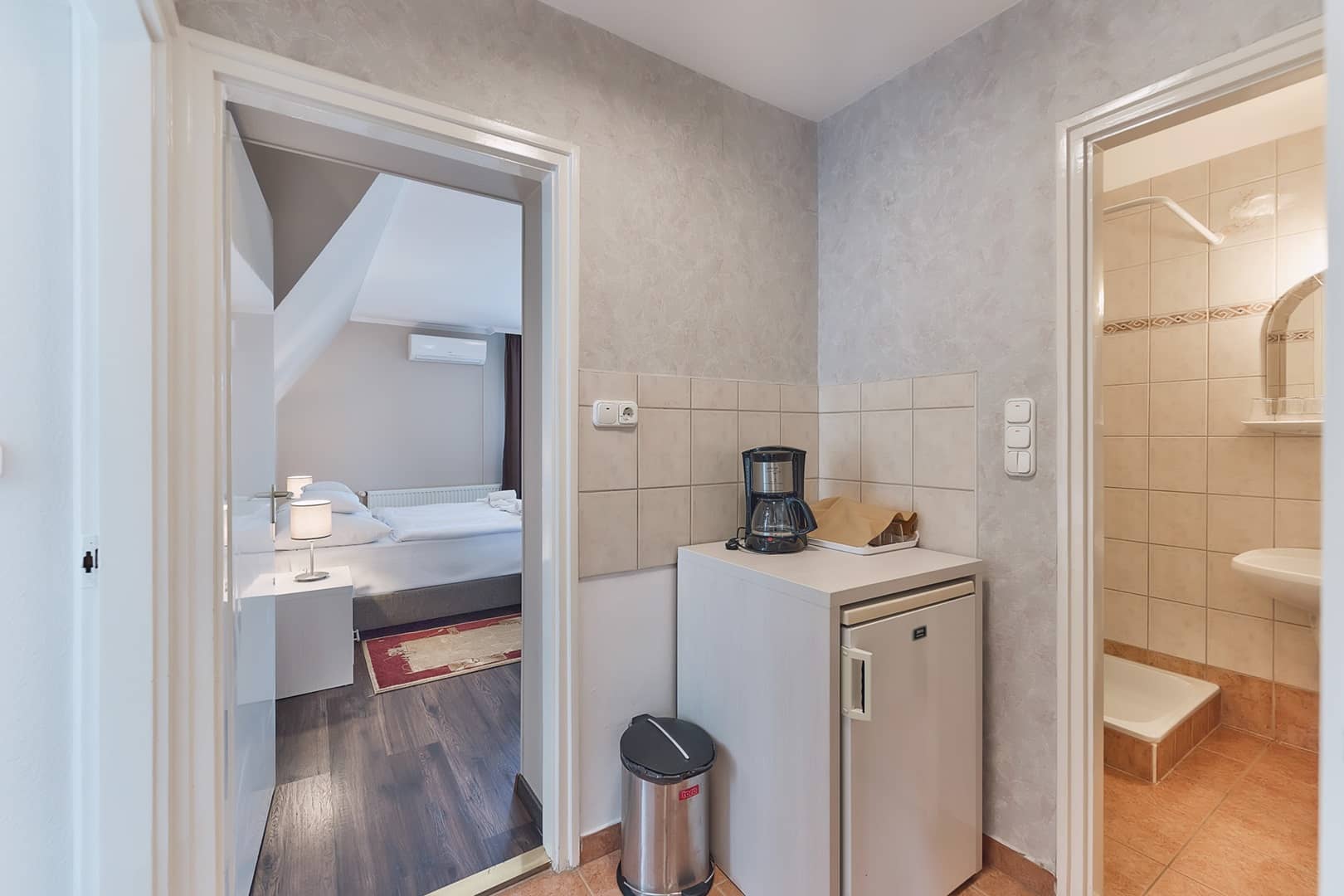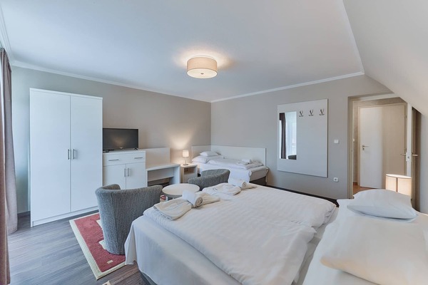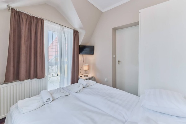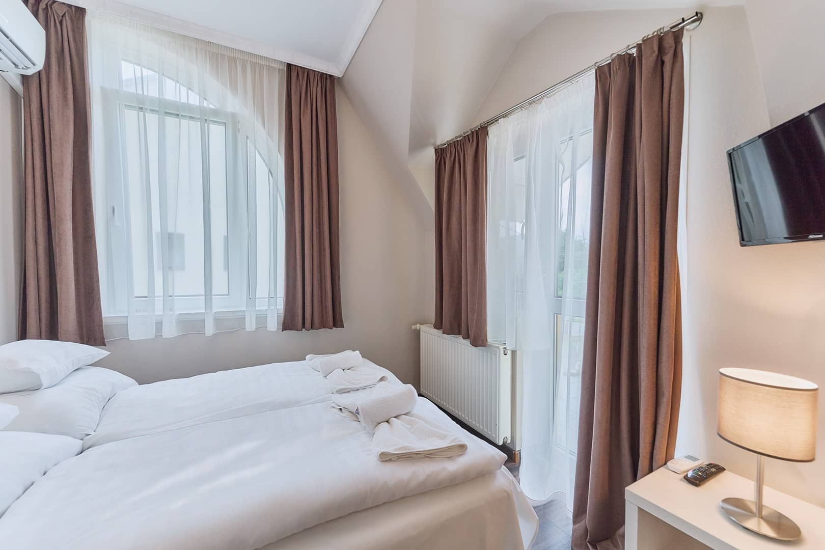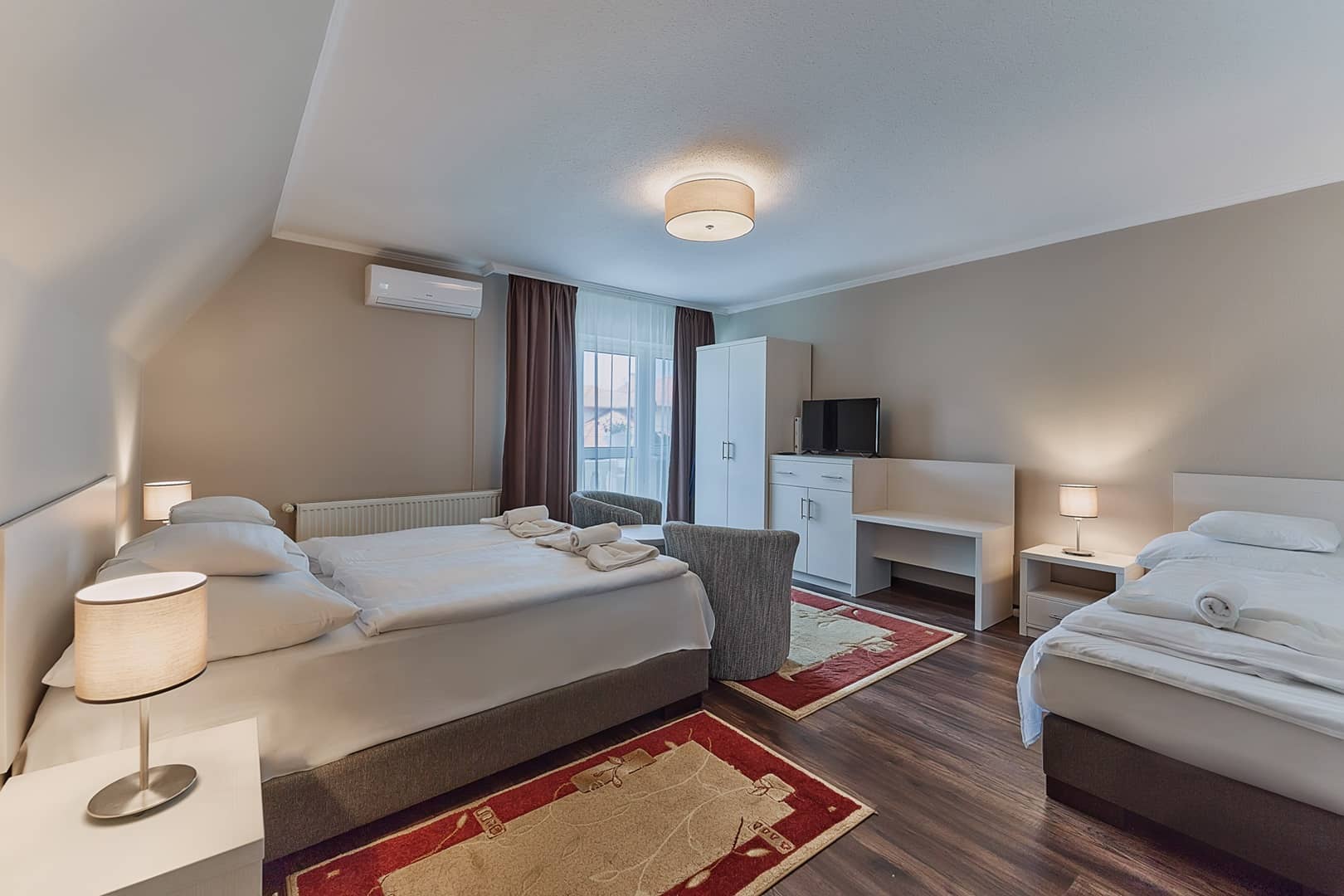 A Panzió területén 3 épület található. Az A épület a Recepció épülete, jobbra helyezkedik el a Panzió területén belül. Megközelíthető legegyszerűbben a teraszon keresztül, át a recepció folyosóján, valamint a kerten keresztül, a biliárd terem előtt jobbra fordulva (este 8 óra után csak ez az az útvonal használható). Összesen 44 fő együttesen elszállásolható. A B épület balra helyezkedik el a Panzió területén belül. Megközelíthető legegyszerűbben a kerten keresztül, a ping-pong rész előtt balra fordulva. Összesen 9 fő együttesen elszállásolható. A D épület leghátul helyezkedik el a Panzió területén. Megközelíthető az Apát utca felől a kerten keresztül, át a ping-pong részen, majd a játszótér mellett elhaladva a külső medence előtti bejáraton. Valamint a Móra Ferenc utca felől a kiskapun át balra az első épület. Összesen 45 fő együttesen elszállásolható. 1 db szoba 40 m2 alapterületű, erkélyes, nemdohányzó szoba. A D épület 1. emeletén található. A szoba maximum 6 fő (5 felnőtt, vagy 4 felnőtt + 2 gyerek) elszállásolására alkalmas. Pótágyazható és babaágy is elhelyezhető. (Kérjük, foglaláskor jelezze felénk előzetesen kérését.) A szoba saját, de közös fürdőszobával rendelkezik és zuhanyzóval, toalettel, tükörrel, polccal felszerelt.