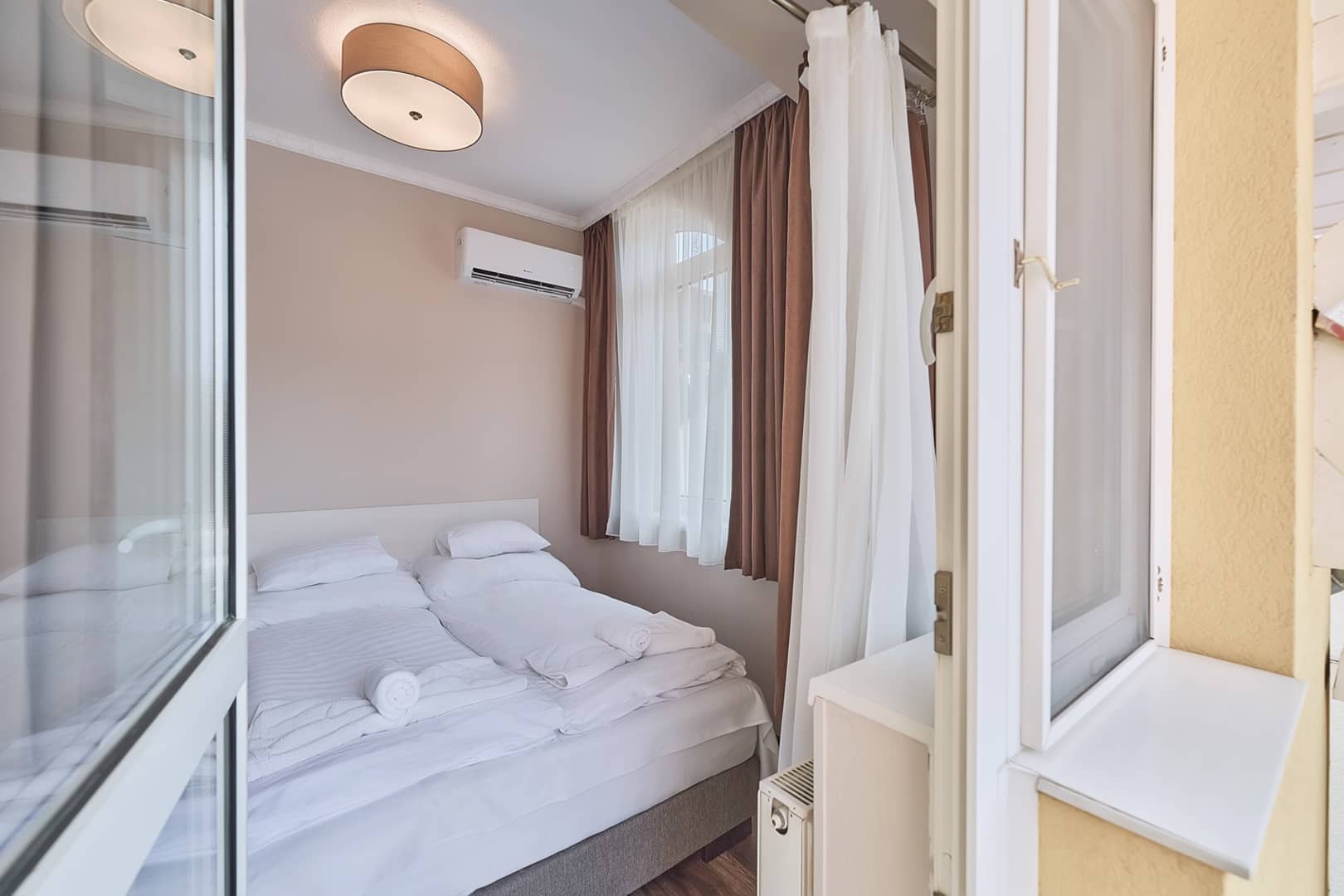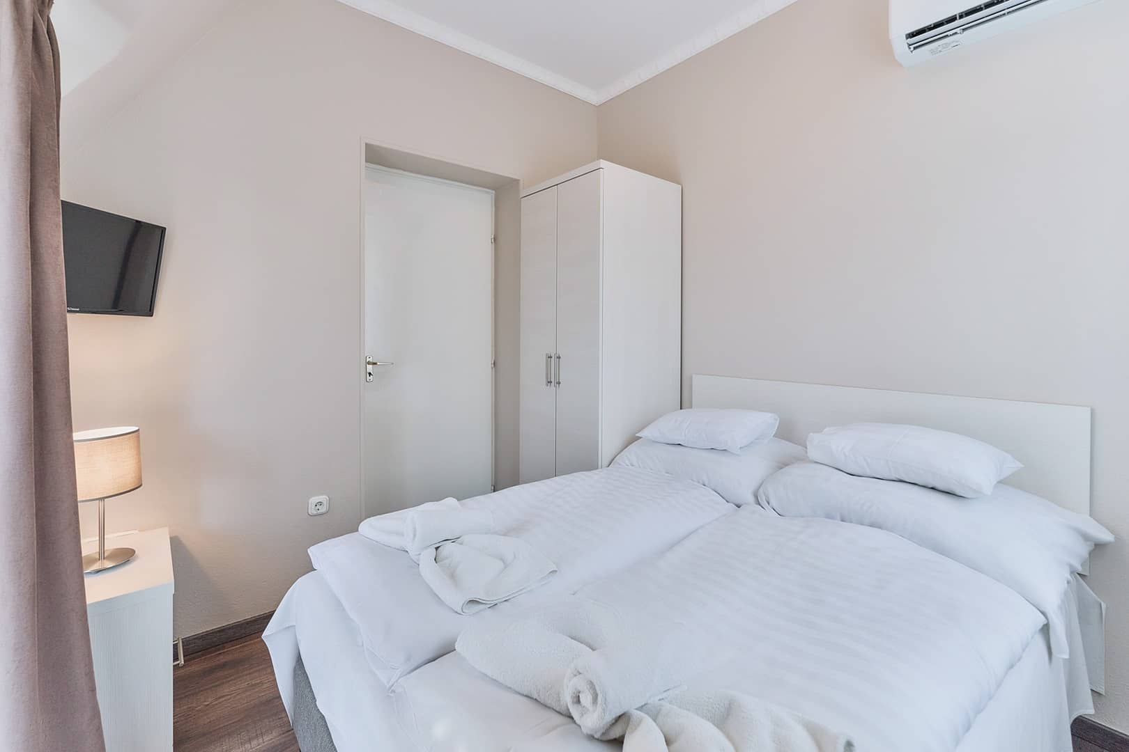 - Egyik hálótér: 1 db franciaágy (160 x 200 cm) + 1 db különálló egyszemélyes ágy (80 x 200 cm)